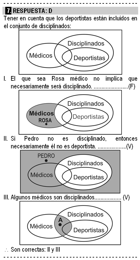 POLEMICAS DEL ULTIMO EXAMEN UNI 2011-II PROBLEMA DEL LUNES 15 (Orden del Tema P Nro 7) 7 Si se afirma que: “algunos médicos son deportistas” y “todo deportista es disciplinado” se puede concluir que: I. Si Rosa es médico, entonces ella es disciplinada. II. Si Pedro no es disciplinado, entonces él no es deportista. III. Algunos médicos son disciplinados. Luego, son conclusiones correctas: A) Sólo I B) Sólo II C) Sólo III D) II y III E) I, II y III Este problema es clasico, ya se ha repetido con diferentes datos en los años 2009 y 2010; se debe interpretar los casos de conjuntos: Para la expresión: "algunos médicos son deportistas" Esto quiere decir que entre los conjuntos de médicos y deportistas "existe" intersección. Para la expresión: “todo deportista es disciplinado” Esto quiere decir que el conjunto de los deportistas esta "incluido" en el conjunto de los disciplinados. No existe el caso que una persona sea deportista y no sea disciplinado.